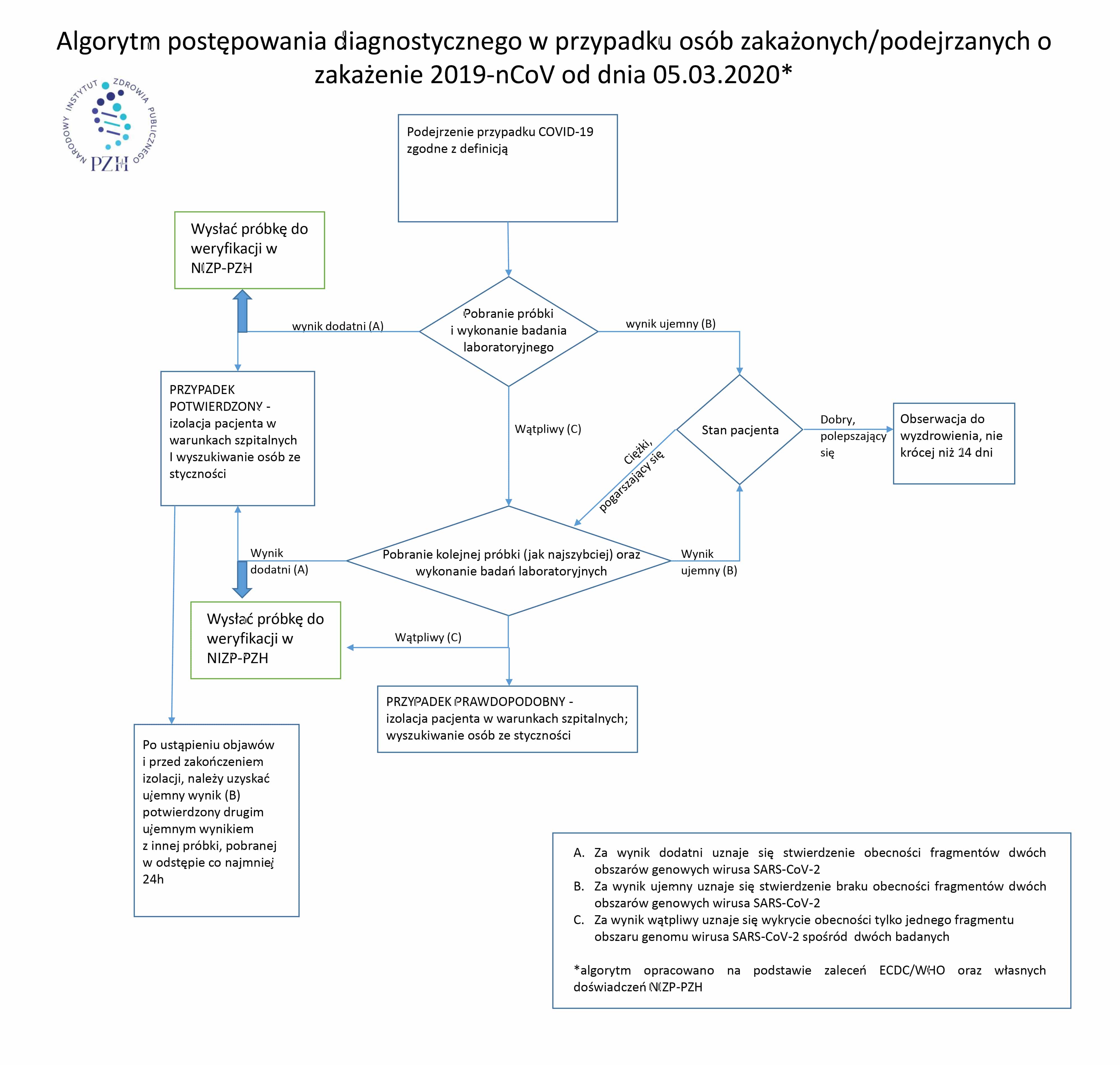 Algorytm postępowania diagnostycznego w przypadku osób zakażonych/podejrzanych o zakażenie 2019-nCoV od dnia 05.03.2020 Post published:6 marca 2020 DO POBRANIAAlgorytm postępowania diagnostycznego w przypadku osób zakażonych/podejrzanych o zakażenie 2019-nCoV od dnia 05.03.2020 – PDF Opens in a new window Opens in a new window Read more articles Previous PostDodatkowy kanał komunikacji dla podmiotów leczniczych Następny wpisWYMAGANIA ODNOŚNIE OZNAKOWANIA I TRANSPORTU PRÓBEK DO BADAŃ LABORATORYJNYCH W KIERUNKU COVID-19 (SARS-CoV-2) Może ci się spodobać również Jak przesyłać materiały do badań? 29 lutego 2020 Komunikat dotyczący mobilnego punktu pobrań przy ul. Powsińskiej 61/63 w Warszawie 2 listopada 2020 Covid-19 – liczba potwierdzonych przypadków z poszczególnych powiatów wg. Dane-i-analizy.pl 11 maja 2020