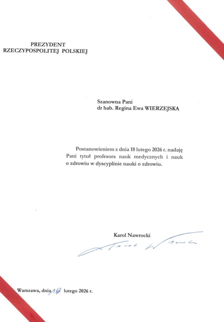 Z przyjemnością informujemy, że dr hab. n. med. i n. o zdr. Regina Wierzejska decyzją Prezydenta RP Karola Nawrockiego otrzymała tytuł profesora nauk medycznych i nauk o zdrowiu w dyscyplinie nauki o zdrowiu.