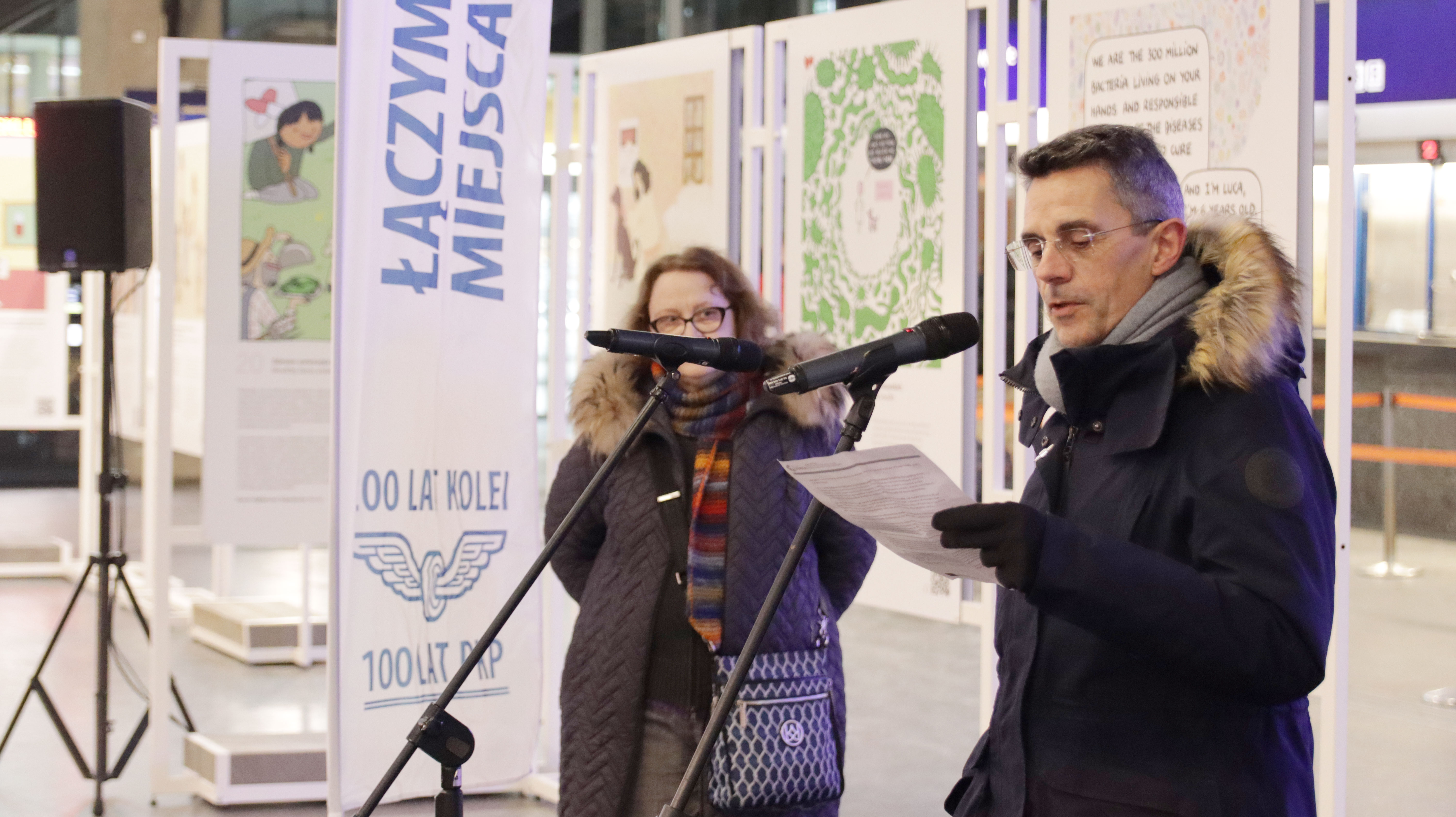 Dr n. med. Bernard Waśko, Dyrektor Narodowego Instytutu Zdrowia Publicznego PZH-PIB,,Dworce kolejowe PKP S.A. są jednymi z najbardziej dostępnych przestrzeni publicznych, przez które każdego dnia przewijają się tysiące osób. To naturalne miejsca do działań edukacyjnych w zakresie zdrowia publicznego, ponieważ medycyna XXI wieku nie rozgrywa się już wyłącznie w gabinetach lekarskich – coraz większą rolę odgrywa świadomość społeczna i codzienne decyzje zdrowotne. Prezentacja wystawy o antybiotykoodporności na Dworcu Centralnym im. Stanisława Moniuszki w Warszawie pokazuje, że przestrzeń transportowa może stać się ważnym miejscem edukacji i dialogu społecznego. Sztuka ma niezwykła moc zatrzymywania nas w biegu. Wierzymy, że takie inicjatywy skłaniają podróżnych do refleksji nad odpowiedzialnym stosowaniem antybiotyków oraz ideą One Health – jednego zdrowia ludzi, zwierząt i środowiska.’’